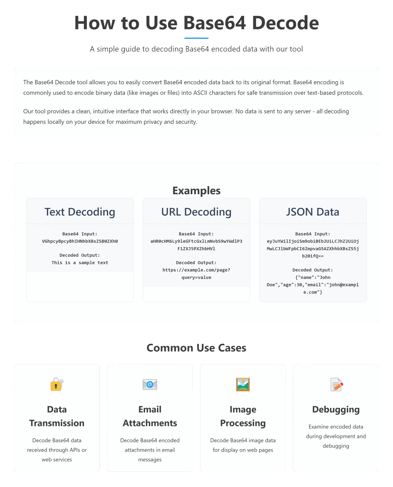 Effortlessly convert Base64 encoded data back to its original format with our Base64 Decode tool.